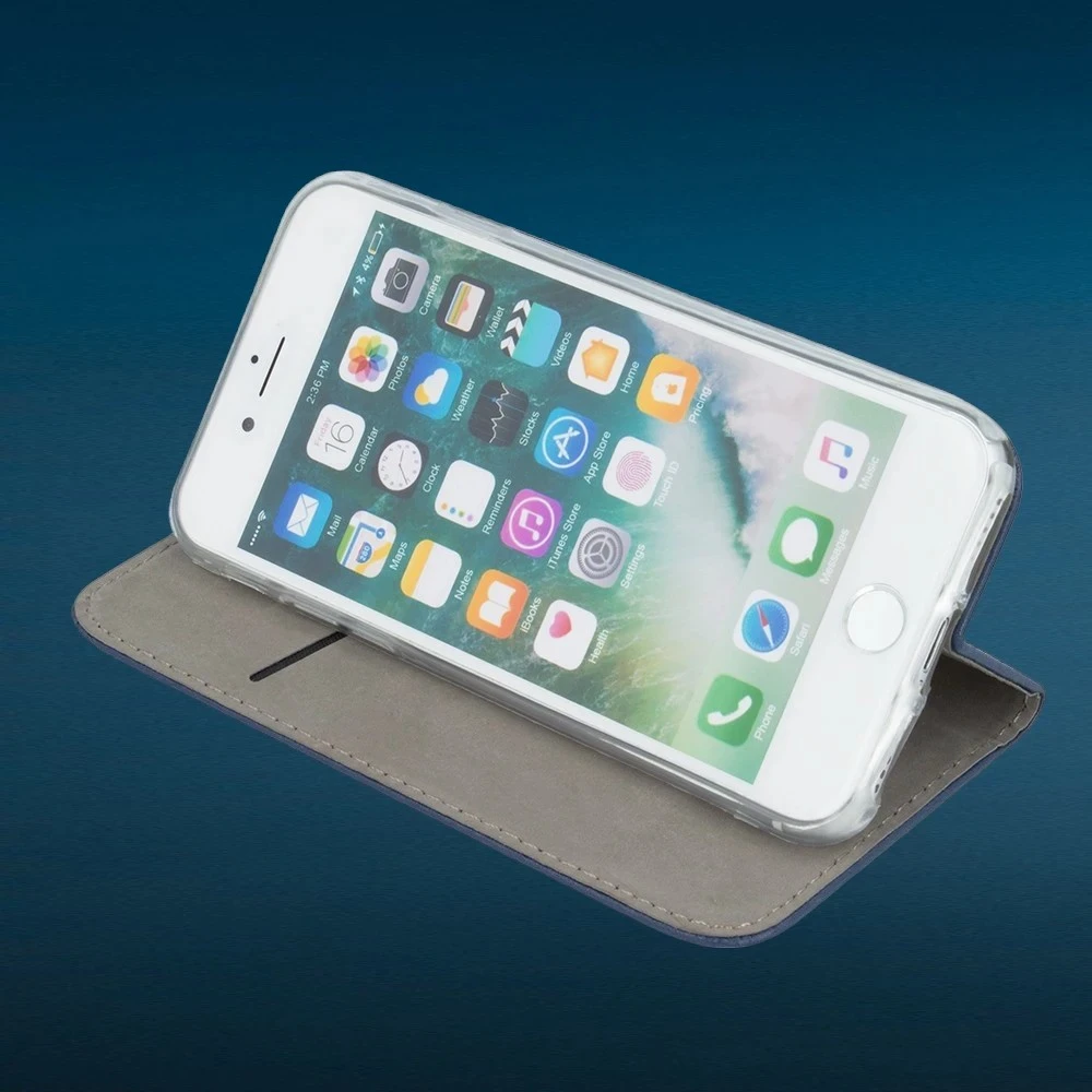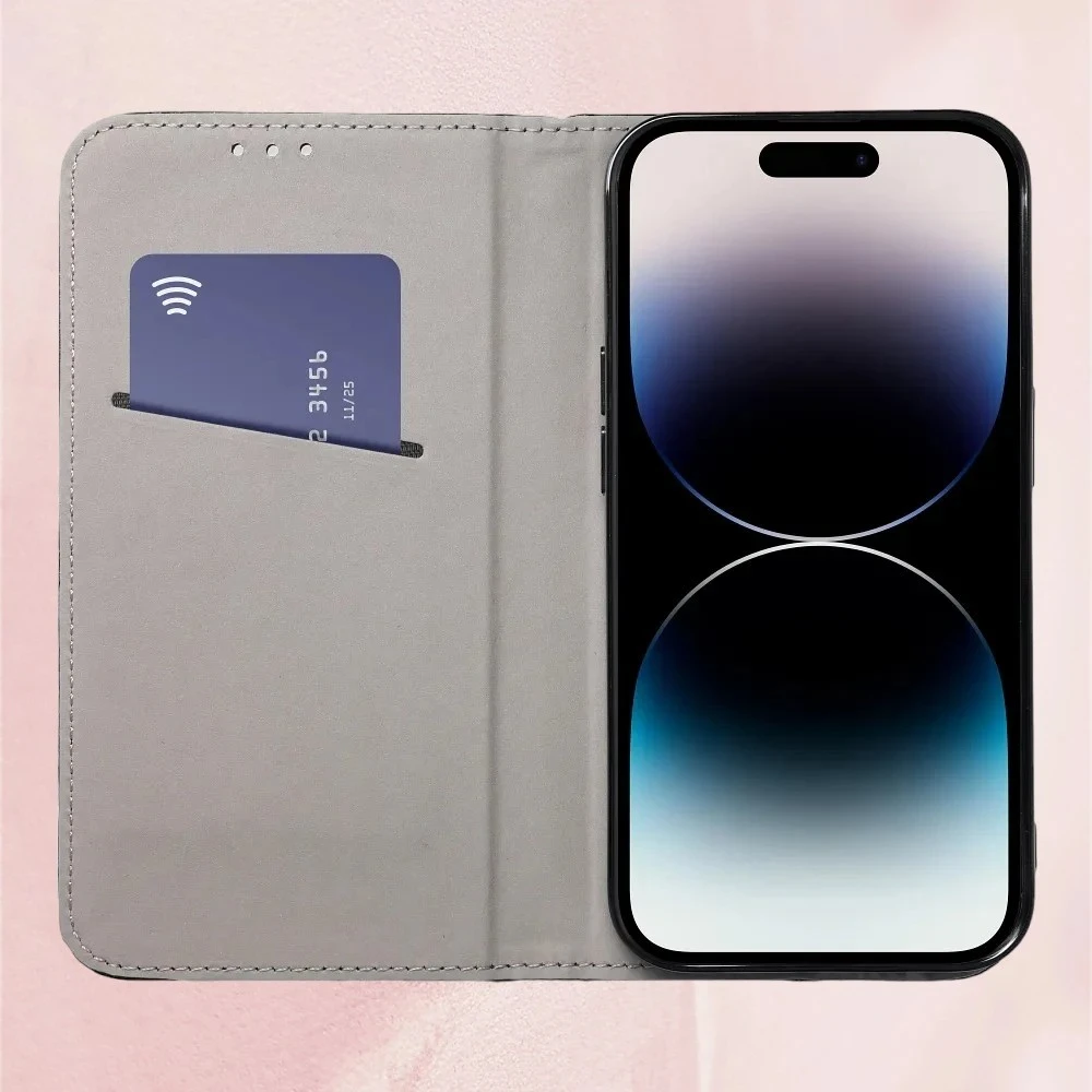 Το κάλυμμα είναι κατασκευασμένο από ανθεκτικό υλικό με υφή απομίμησης άνθρακα. Το προϊόν διαθέτει ένα απαλό εσωτερικό που προστατεύει την οθόνη από τις γρατζουνιές και μια πρακτική τσέπη για κάρτες. Η ιδανικά ρυθμιζόμενη επικάλυψη TPU κρατά το τηλέφωνό σας σταθερό. Υπάρχει η δυνατότητα κλεισίματος της θήκης χρησιμοποιώντας έναν μαγνήτη, τοποθετημένο κάτω από τη θήκη. Επιπλέον, το πίσω μέρος αποκλίνει και καθιστά εύκολη τη ρύθμιση της θήκης στην οριζόντια θέση για την άνετη παρακολούθηση φωτογραφιών ή βίντεο.